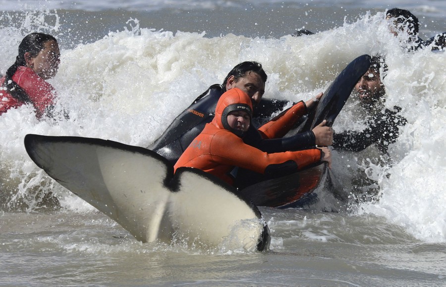 Read moreRescuers and volunteers work to successfully return a killer whale to the sea near Mar Chiquita, Argentina, on September 16, 2019. Seven killer whales were stranded on the coast before rescuers and volunteers returned six of them to sea, but one died in the process. #