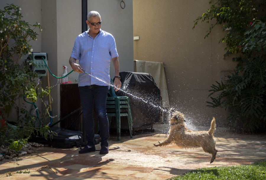 Read moreIsrael's Blue and White party leader and former IDF chief of staff Benny Gantz waters his garden and plays with his dog at his home in Rosh Haayin, Israel, on September 13, 2019. #