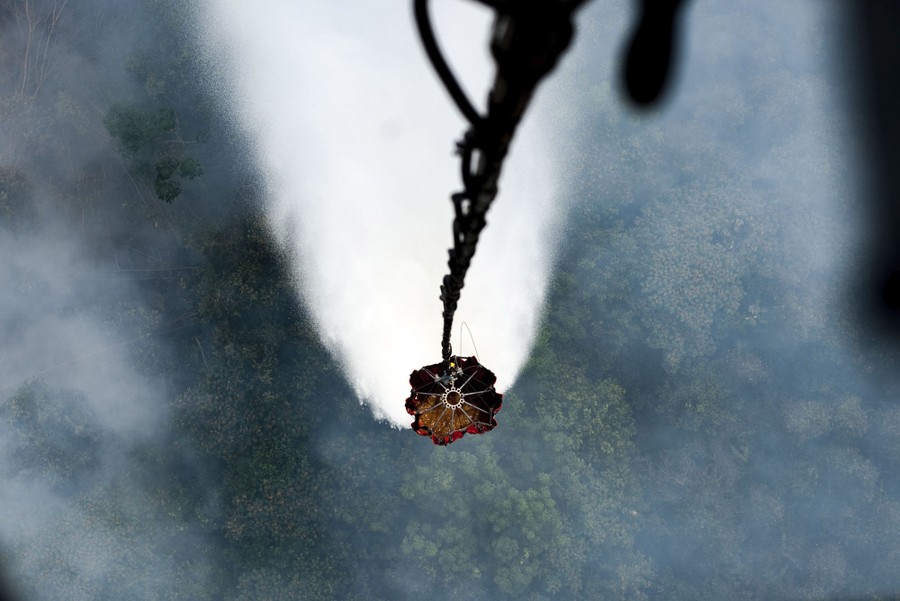 Read moreA helicopter drops water to extinguish forest fires in Kahayan Hilir, Central Kalimantan, Indonesia, on September 18, 2019. Dozens of helicopters operating in six provinces on Sumatra and Borneo island have dropped tons of water as part of the efforts to battle forest fires that have spread a thick, noxious haze around Southeast Asia. #
