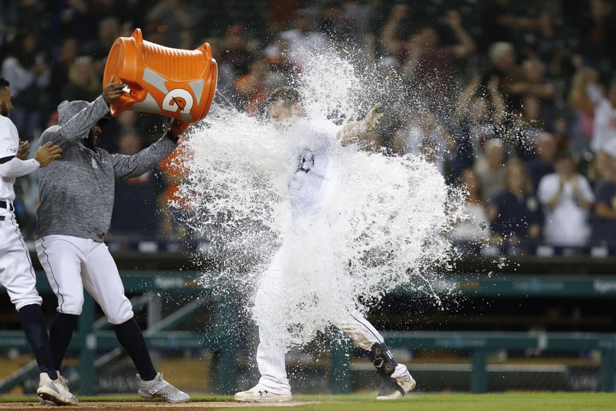 Read moreThe Detroit Tigers' John Hicks is doused with water by Ronny Rodriguez after hitting a grand slam against the Baltimore Orioles' Ryan Eades during the 12th inning of a baseball game on September 14, 2019, in Detroit. The Tigers won 8-4. #