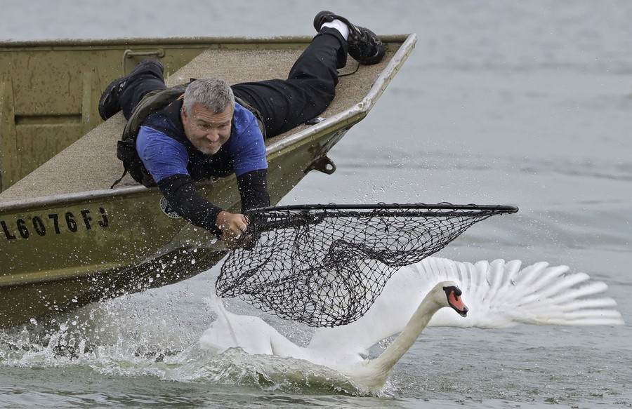 Read moreSteve Platt, a supervisor at the Lakeland Parks and Recreation Department, reaches for a swan during the 39th annual swan roundup on Lake Morton in Lakeland, Florida, October 22, 2019. The city's parks and recreation department catches all the swans to administer health examinations before they are released back into the lake. #
