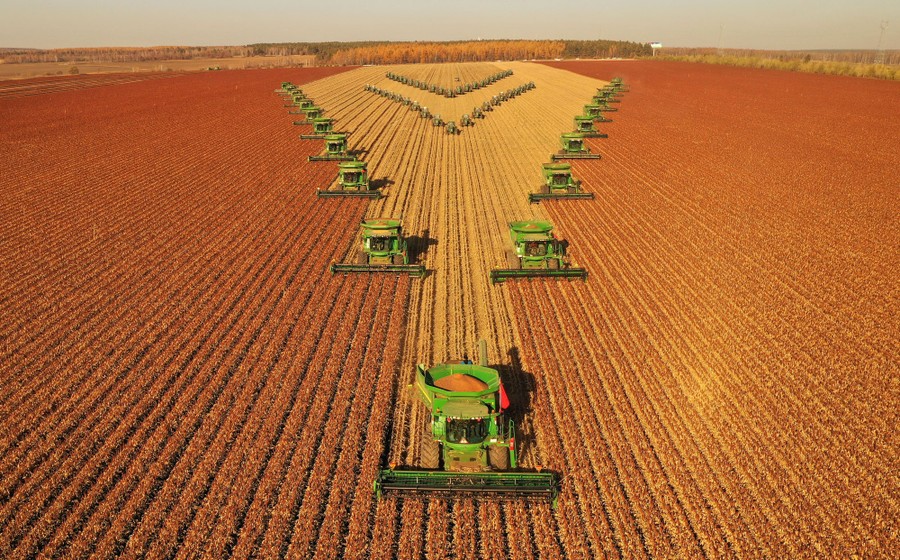 Read moreAn aerial view of harvesters, stubble choppers, and soil preparation machines working in a sorghum field on Nen River farm in Nenjiang, Heilongjiang province, China, on October 17, 2019. #