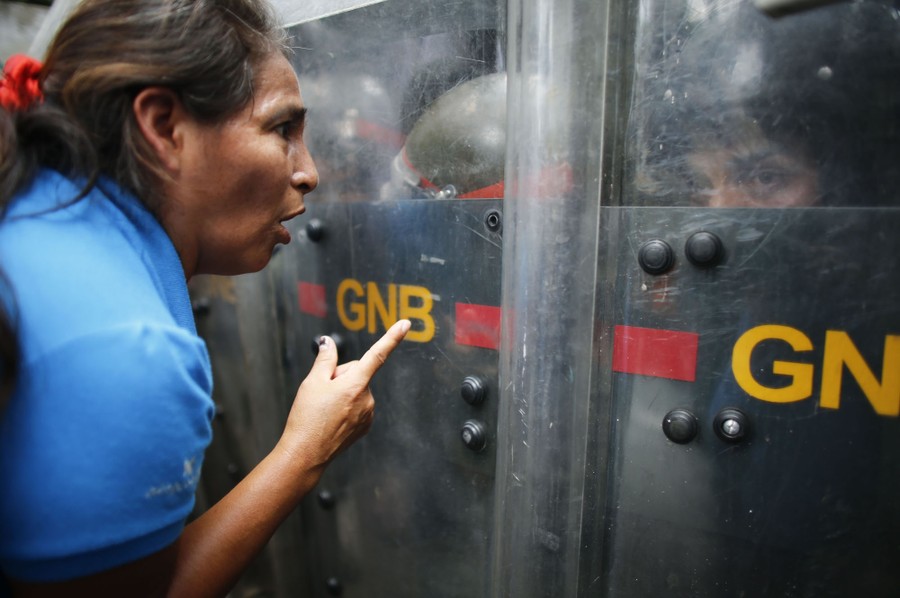 Read moreAn opposition protester speaks to National Guard soldiers blocking the way to the headquarters of the state electric company in Caracas, Venezuela, on October 24, 2019. Demonstrators mobilized in support of the inhabitants of the western state of Zulia, which suffers daily power outages that sometimes last more than 20 hours. #
