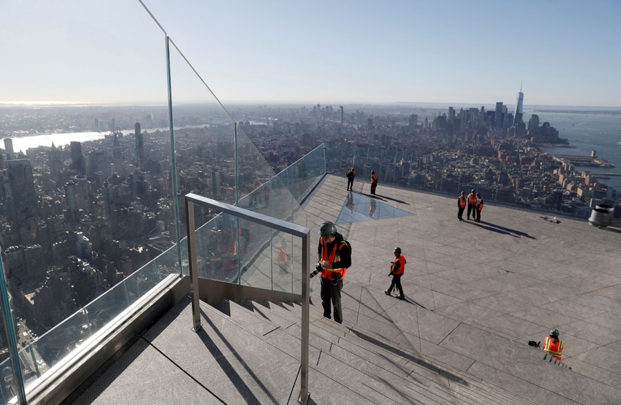 Read moreMembers of the media walk around on the "Edge" sky deck, advertised as the Western Hemisphere's highest outdoor observation deck, during a press preview of the 100th and 101st floors of the Hudson Yards development in New York City on October 24, 2019. #