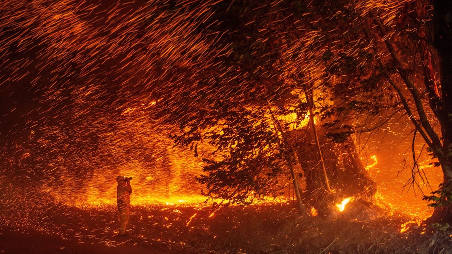 Read moreA photographer takes photos amid a shower of embers as wind and flames rip through the area during the Kincade fire, near Geyserville, California, on October 24, 2019. #
