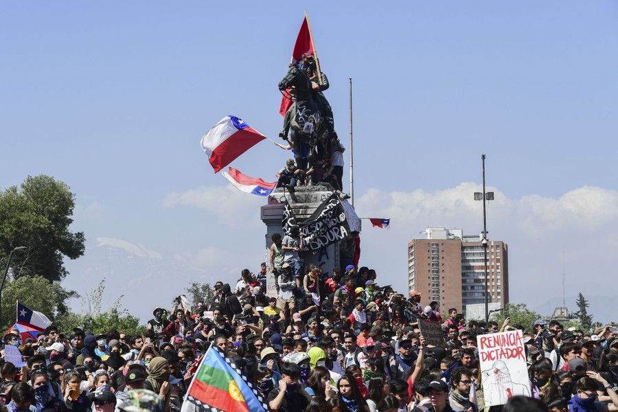 Read moreDemonstrators take cover as they are sprayed by security forces with a water cannon during a protest against Chile's state economic model in Santiago on October 22, 2019. #