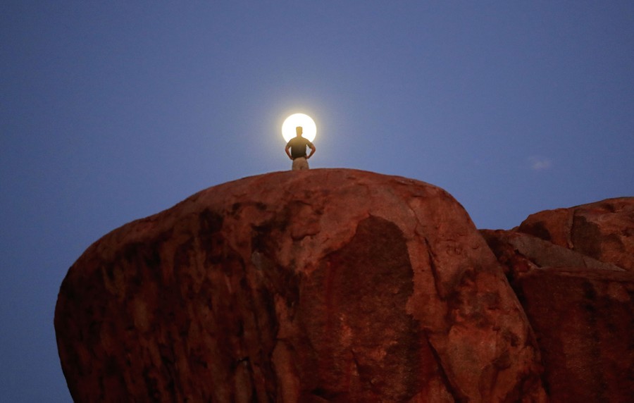 Read moreA team member from the Stanford Solar Car Project of the U.S. looks at the setting moon on the Devils Marbles in Australia on Day 3 of the 2019 Bridgestone World Solar Challenge on October 15, 2019. #