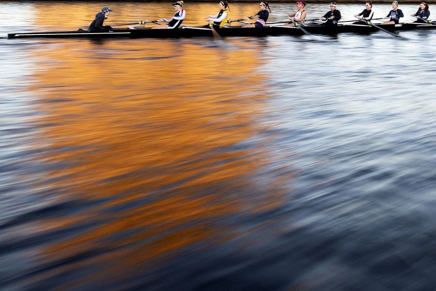Read moreThe Radcliffe Women's Heavyweight Crew team trains on the Charles River in preparation for the Head of the Charles Regatta on October 16, 2019, in Cambridge, Massachusetts. The Harvard women's crew teams compete as Radcliffe Crew to honor all-women's Radcliffe College, which merged athletics departments with Harvard in 1976. #