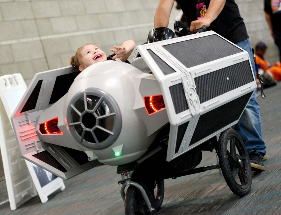 Read moreAttendees maneuver a cart shaped like Darth Vader's TIE fighter from Star Wars, at the 2019 Los Angeles Comic-Con at Los Angeles Convention Center on October 12, 2019. #