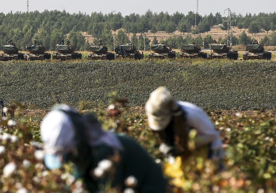 Read moreFarmers gather cotton as Turkish army tanks are seen at a staging area close to the border with Syria in Sanliurfa province, southeastern Turkey, on October 17, 2019. #
