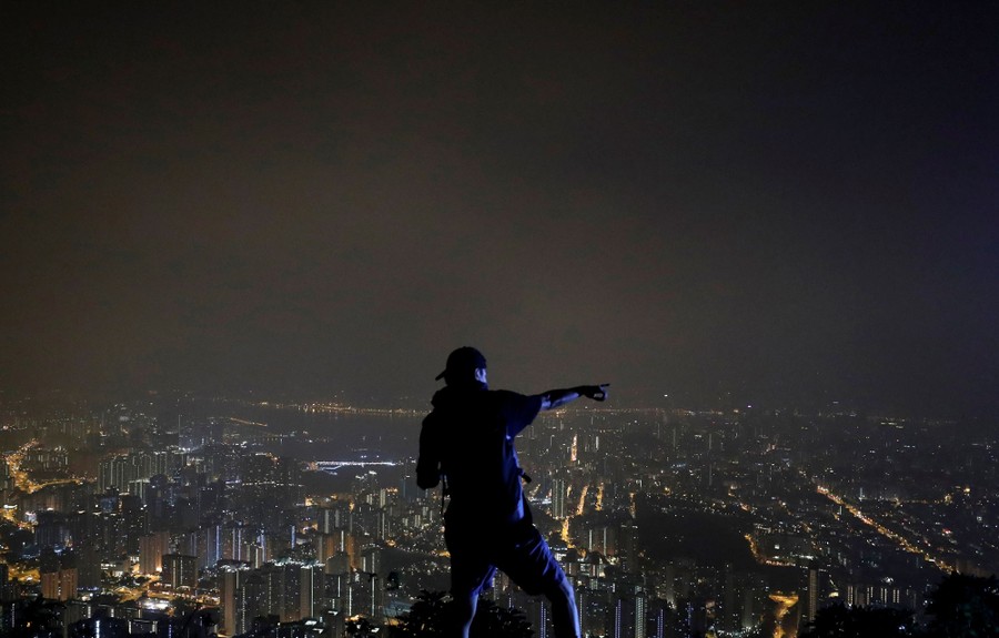 Read moreA pro-democracy protester reacts as he moves part of the 4-meter-tall "Statue of Lady Liberty Hong Kong" with his friend on the iconic Lion Rock, in Hong Kong, China, on October 13, 2019. #
