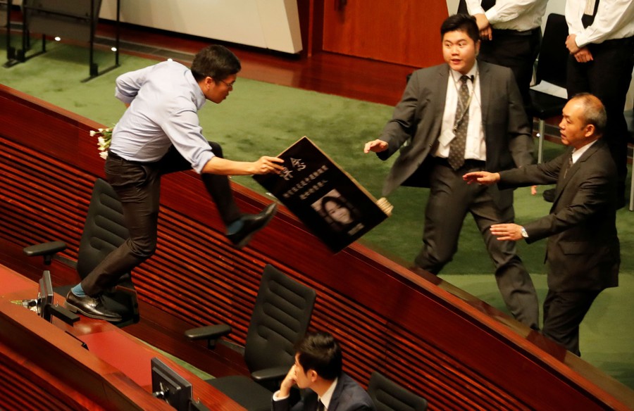 Read moreA lawmaker jumps on furniture as he tries to follow Hong Kong's Chief Executive Carrie Lam (not pictured), when Lam left the Legislative Council in Hong Kong, China, on October 17, 2019. #