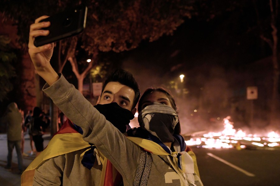 Read moreTwo protesters take a selfie as barricades burn in the background during a demonstration called by the local Republic Defense Committees in Barcelona, Spain, on October 16, 2019, after police arrested 51 people across Catalonia overnight following violent protests. #