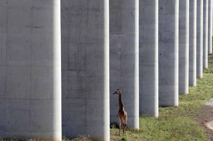Read moreA giraffe walks near pillars supporting elevated tracks that allow movement of animals below the Standard Gauge Railway line linking Nairobi and Naivasha inside Nairobi national park in Nairobi, Kenya, on October 16, 2019. #