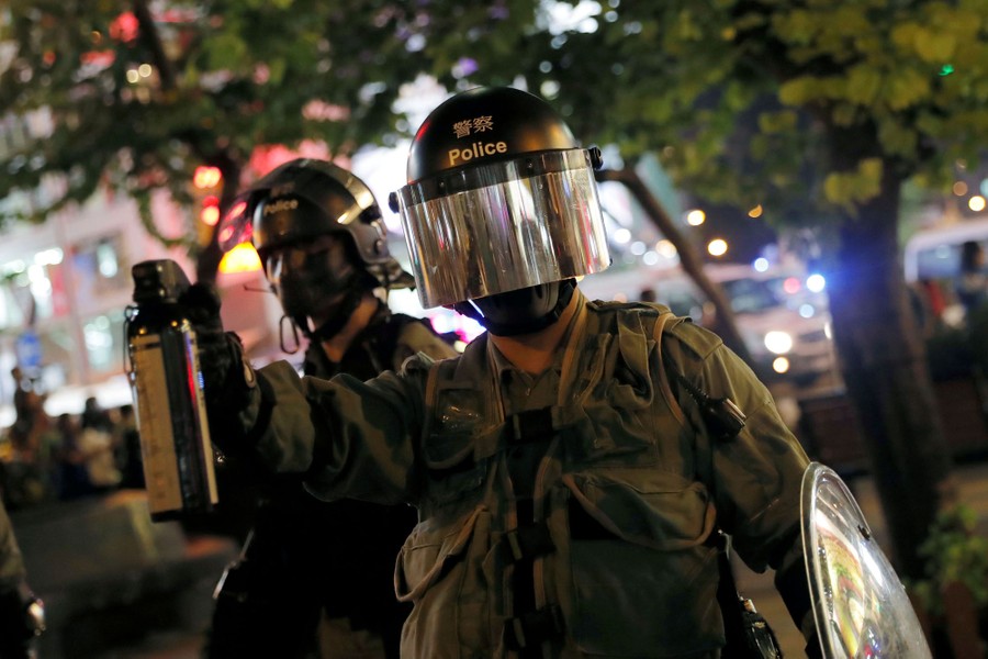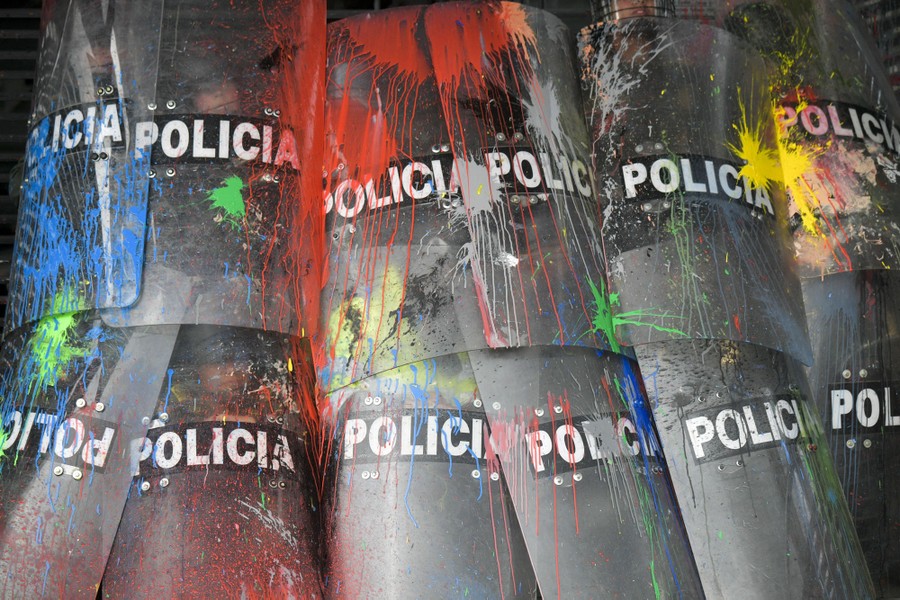 Read moreRiot police take cover behind their paint-covered shields during clashes with university students demanding better funding for education in Bogotá, Colombia, on October 10, 2019. #
