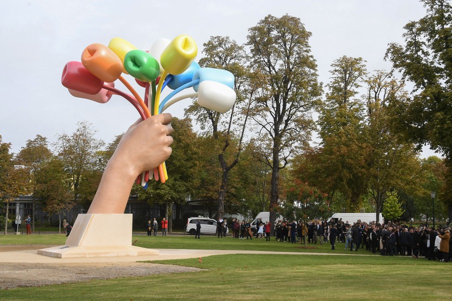 Read moreA creation titled "Tulips Bouquet" by the U.S. artist Jeff Koons is displayed next to the Petit Palais on October 4, 2019, in Paris. "Bouquet of Tulips" is a monumental work in bronze, stainless steel, and aluminum polychrome, 10 meters high and eight meters wide, weighing 27 tons, offered to France by Koons to pay respect to the victims of the 2015 terrorist attacks in Paris. #