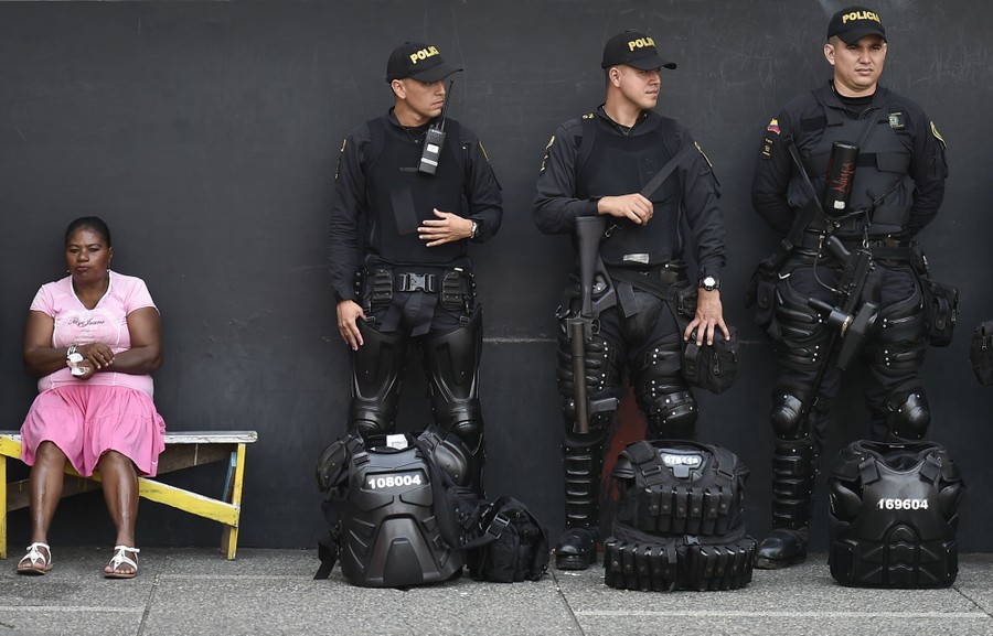 Read moreA woman sits next to riot police during a rally of supporters of former Colombian President Álvaro Uribe in Cali, Valle del Cauca department, Colombia, on October 6, 2019. Hundreds marched Sunday in different parts of Colombia and in Miami in support of Uribe, summoned by the Supreme Court of Justice for alleged witness tampering. #