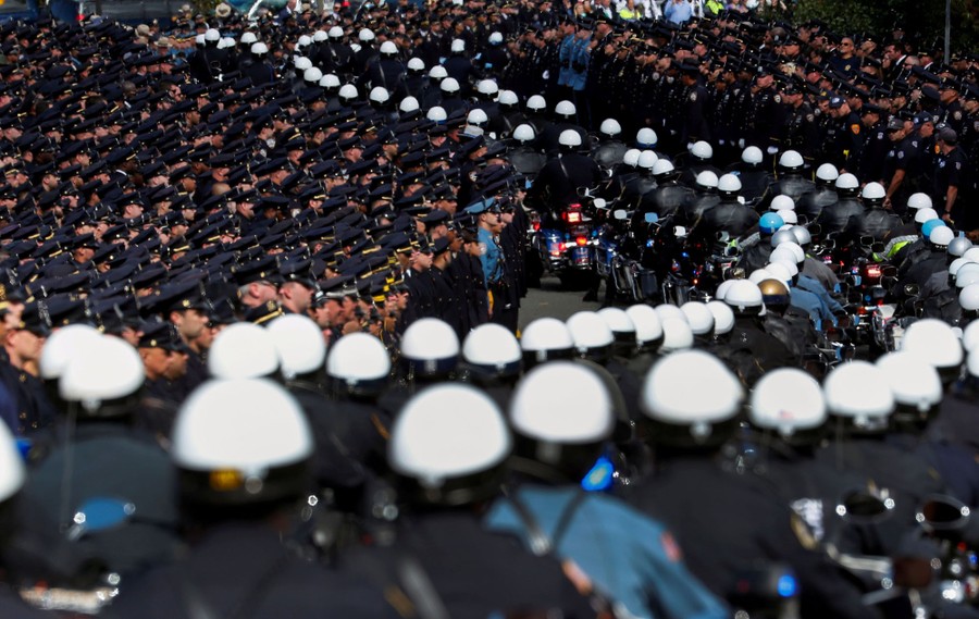 Read morePolice motorcycles lead a procession ahead of the casket carrying New York City Police Department officer Brian Mulkeen from his funeral service at the Sacred Heart Church in Monroe, New York, on October 4, 2019. Mulkeen was killed while making an arrest, when another police officer inadvertently shot him. #