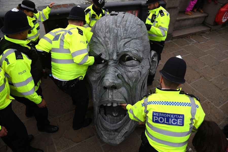 Read morePolice remove a giant sculpture from Lambeth Bridge on October 7, 2019, in London. Climate-change activists are gathering to block access to various government departments as they start a two-week protest in central London. #