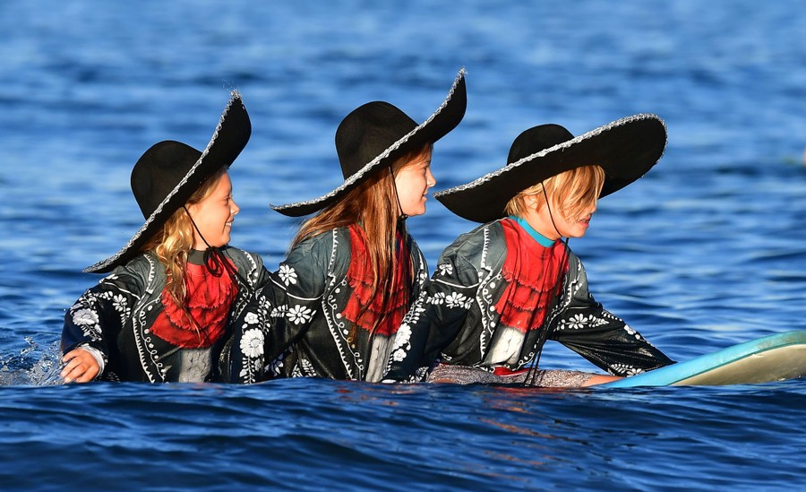Read moreThe surfers Leina Decker (left), Rory Chalupnik (center), and Reid Decker await waves while dressed as mariachi musicians during the 16th Annual Blackies Halloween Surf event in Newport Beach, California, on October 26, 2019. #