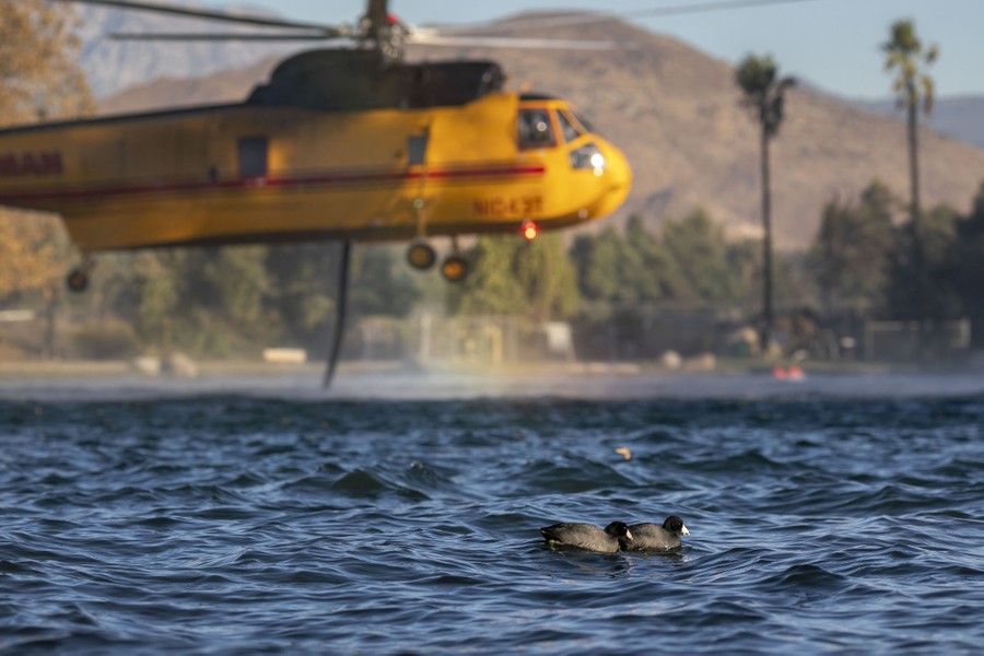 Read moreCoots swim as a firefighting helicopter picks up water to drop on the 46 Fire near San Bernardino, California, on October 31, 2019. The National Weather Service issued a rare extreme red-flag warning for Southern California, for gusts that could be the strongest in more than a decade, exceeding 80 mph and lowering humidity to 1 or 2 percent, a perfect recipe for dangerous, fast-moving wildfires. #