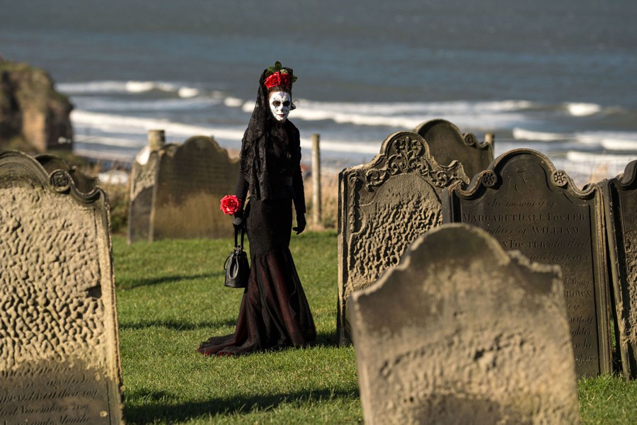 Read moreA participant in costume walks between the gravestones beside St Mary's Church during the biannual "Whitby Goth Weekend" festival in Whitby, England, on October 27, 2019. #