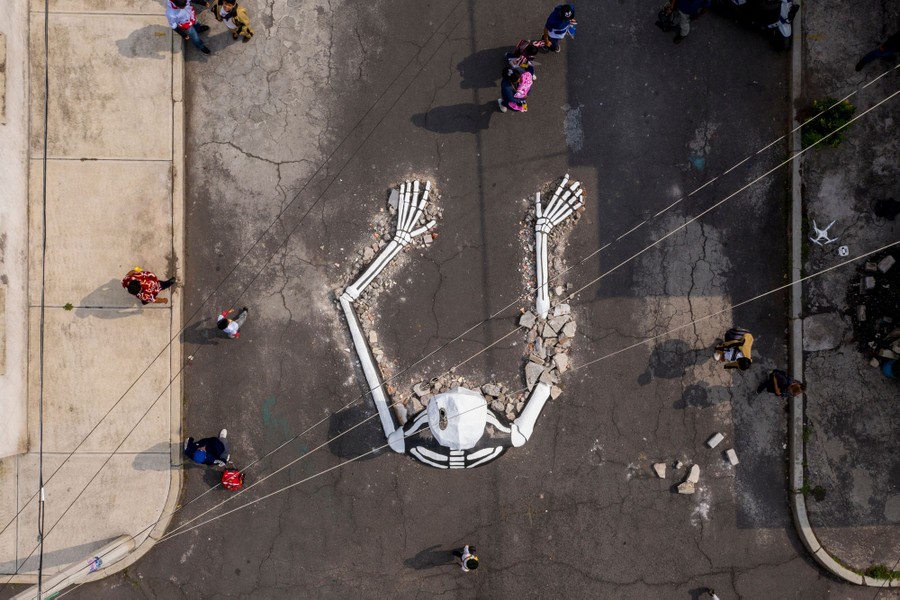 Read moreLocals walk by a huge cardboard skeleton made by artisans in a street in the Tlahuac neighborhood, in Mexico City, on October 28, 2019, ahead of the Day of the Dead celebrations. #
