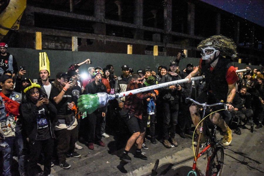 Read moreA person rides towards his opponent (not in frame) during a round of bike jousting at the annual Bike Kill event on October 26, 2019, in New York City. Bike Kill is a gathering of bike enthusiasts organized by the Black Label Bike Club who custom fabricate "mutant" bicycles for the event. The culmination of the event involves tall bike jousting. #