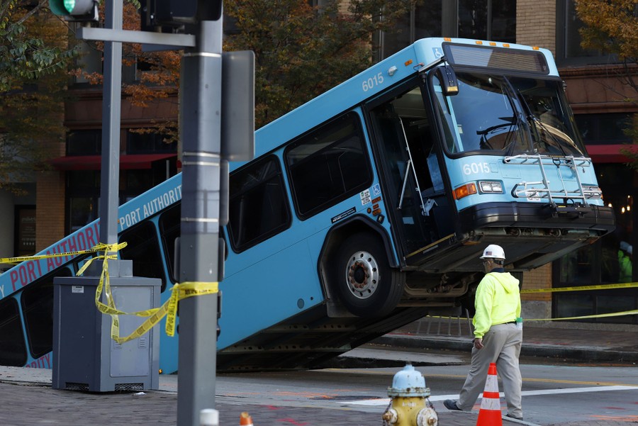 Read moreThe front of a city bus is up in the air after a sinkhole opened under it during rush hour in downtown Pittsburgh on October 28, 2019. The Port Authority of Allegheny County says only the driver and one passenger were aboard the bus when it plunged into the hole. The passenger was taken to a hospital for a minor injury, and the driver was uninjured. #