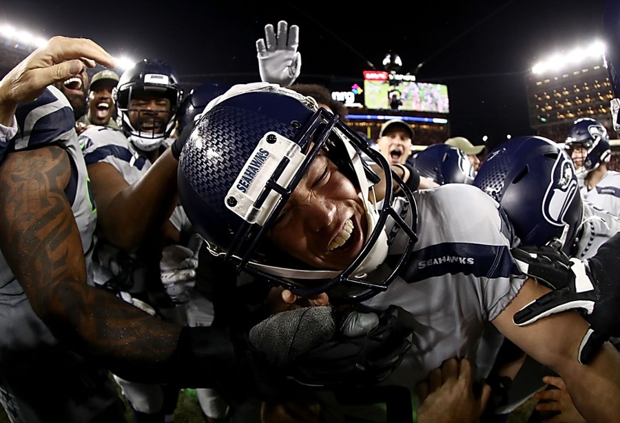 Read moreSeattle Seahawks kicker Jason Myers celebrates with teammates after making the winning 42-yard field goal in overtime to win 27-24 over the San Francisco 49ers at Levi's Stadium on November 11, 2019, in Santa Clara, California. #