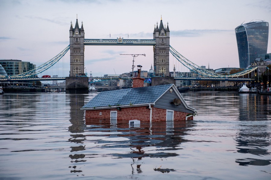 Read moreEnvironmental protest group Extinction rebellion floats a replica of a British house near Tower Bridge on the River Thames in an action entitled "Our house is flooding" on November 10, 2019, in London, England. #