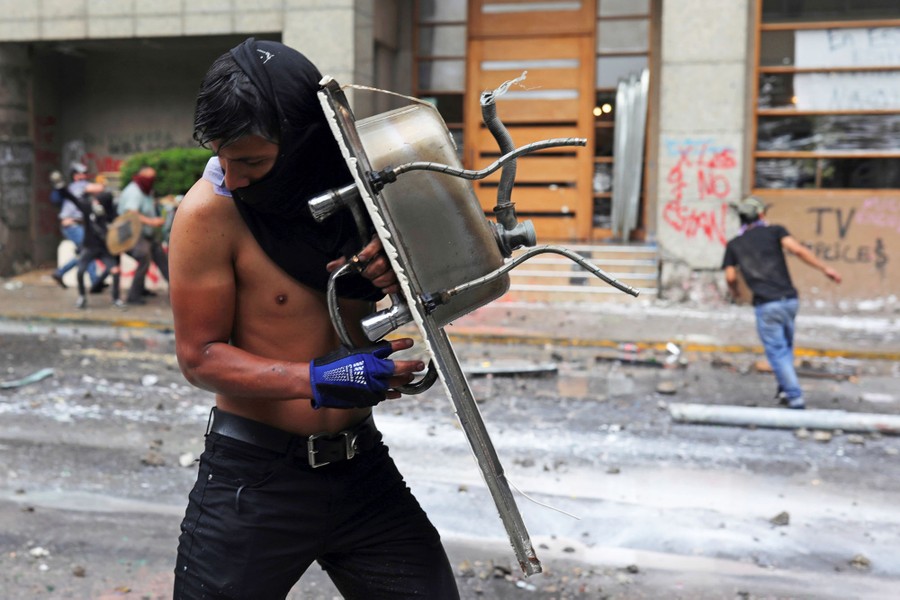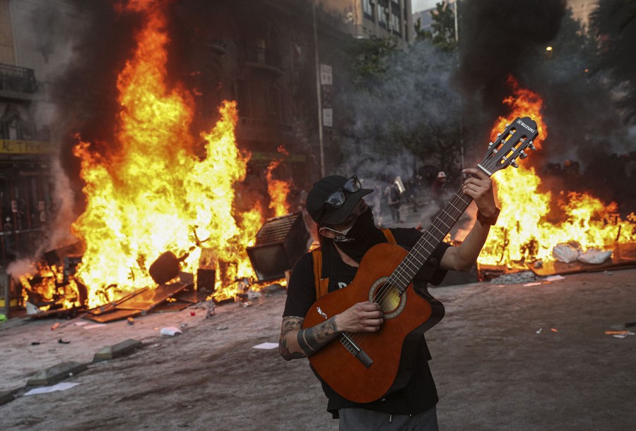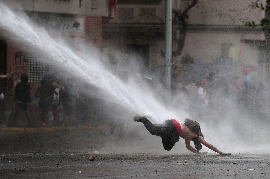 Read moreA demonstrator holds a Chilean flag near a riot police officer and vehicle amid laser beams during a protest against Chile's government in Santiago, Chile, on November 12, 2019. #