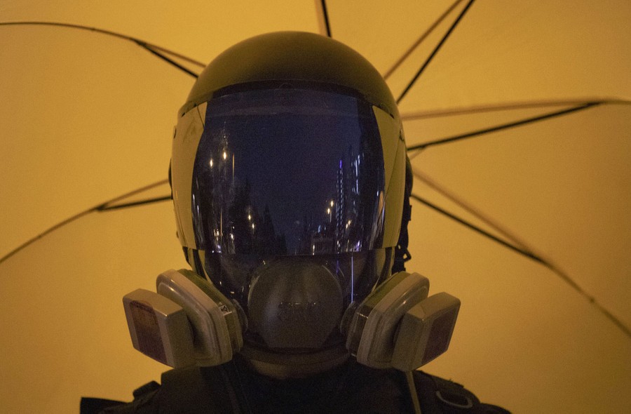 Read moreA protester wearing helmet and tear gas mask holds a yellow umbrella outside the Hong Kong Polytechnic University campus in Hong Kong on November 14, 2019. Hong Kong police warned protesters on Thursday that they were moving "one step closer to terrorism" by sinking the city into chaos, as riot squads skirmished with militant students at major universities. #