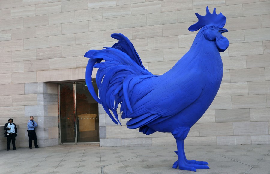 Read moreSecurity officers keep watch near the sculpture of a giant blue cockerel named "Hahn/Cock" by German artist Katharina Fritsch, at the National Gallery of Art in Washington, D.C., on November 10, 2019. #