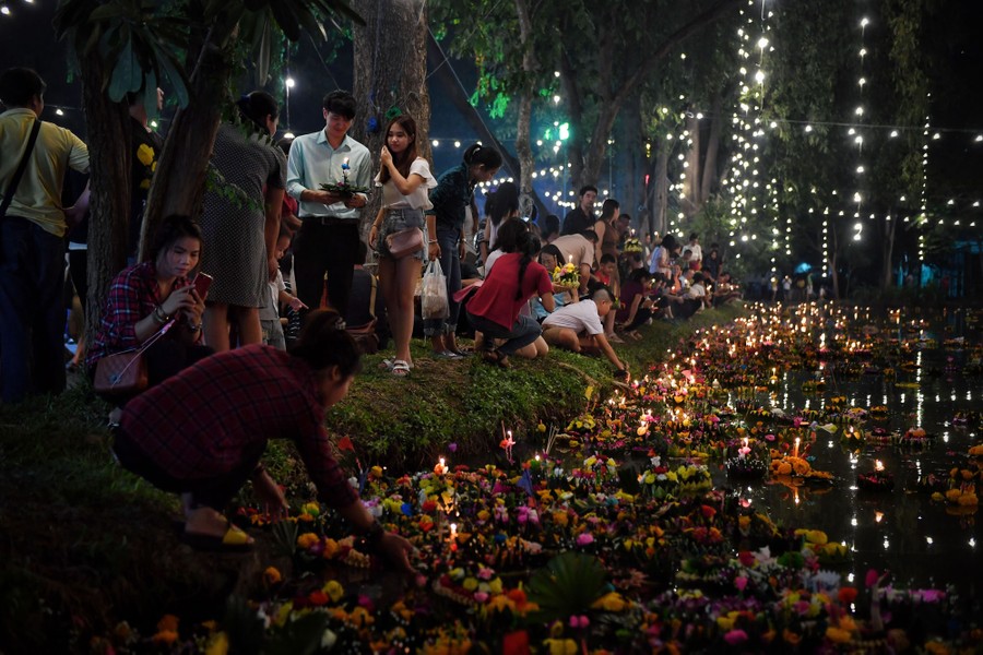 Read morePeople place krathongs, or floating baskets, in a pond to mark the annual Loy Krathong festival in Bangkok on November 11, 2019. Loy Krathong takes place on the evening of the full moon of the 12th month in the traditional Thai calendar, which usually falls in November. #