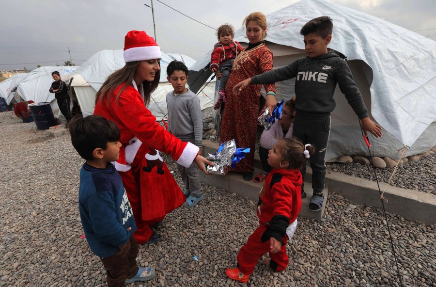 Read moreA Syrian woman dressed as Santa Claus gives gifts to children at the Gawelan refugee camp, west of Erbil, the capital of the autonomous Kurdish region of northern Iraq, on December 26, 2019. #