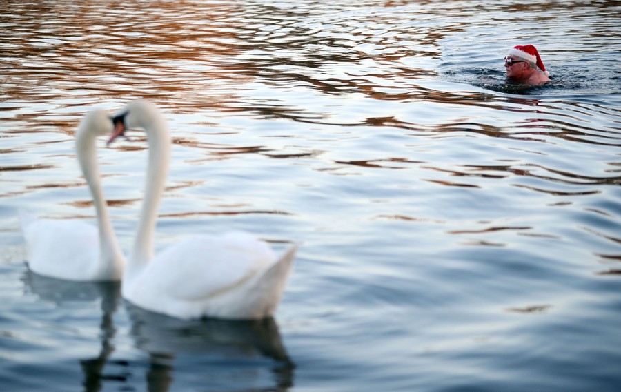 Read moreA swimmer passes swans as he takes a dip in the Serpentine River before the annual Christmas Day Peter Pan Cup handicap race in Hyde Park in London, England, on December 25, 2019. #
