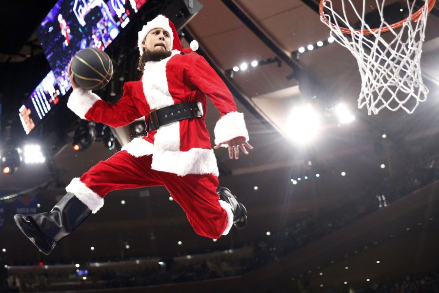 Read moreA "dunking Santa" is airborne for a shot, after using a trampoline to get the height, during a time-out in the second half of an NBA basketball game between the New York Knicks and the Washington Wizards in New York, on December 23, 2019. #