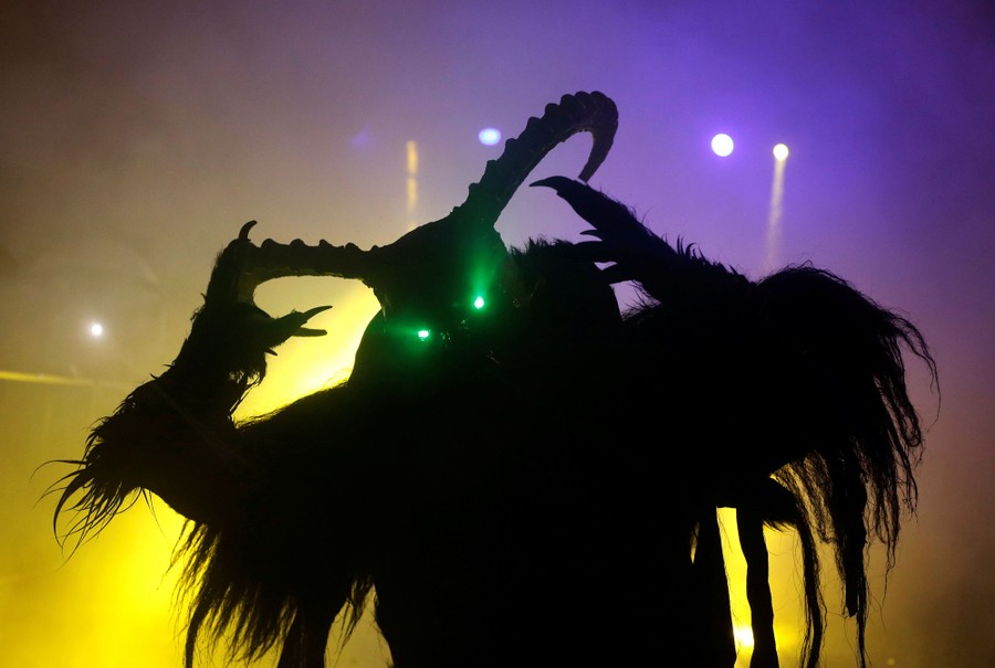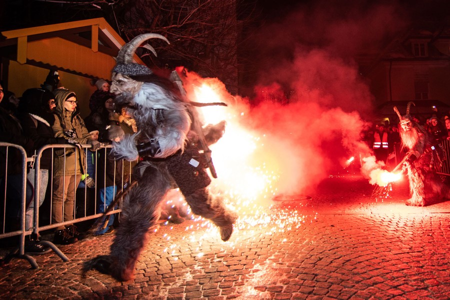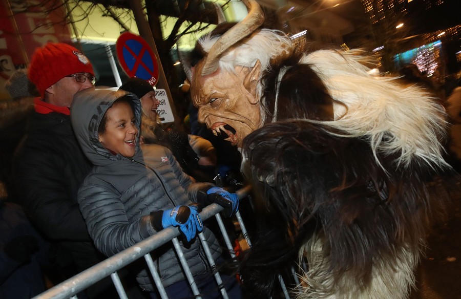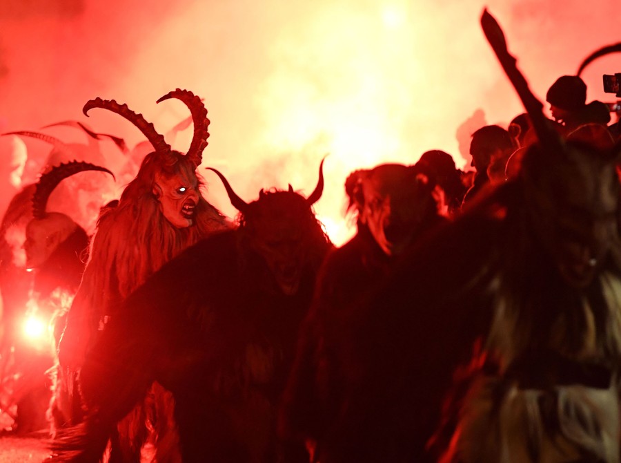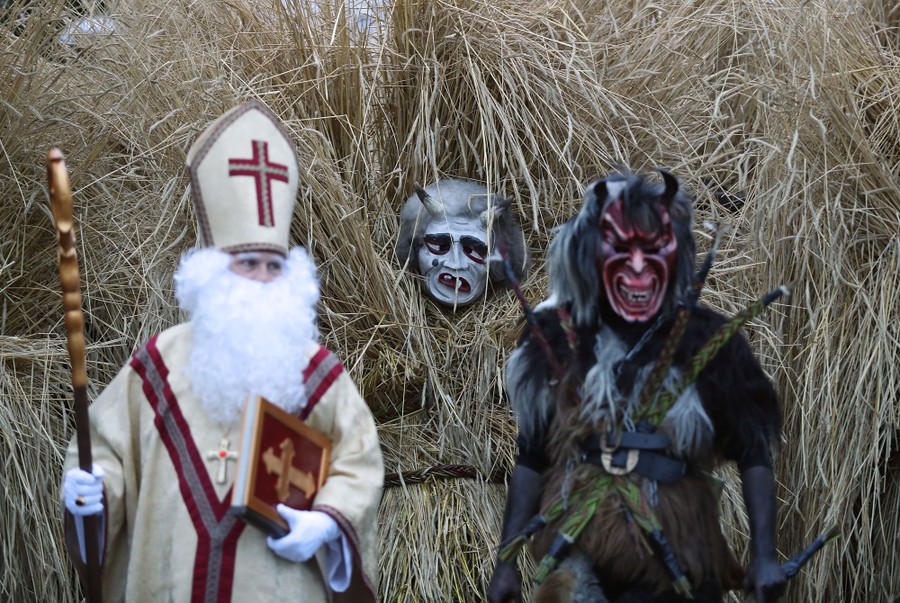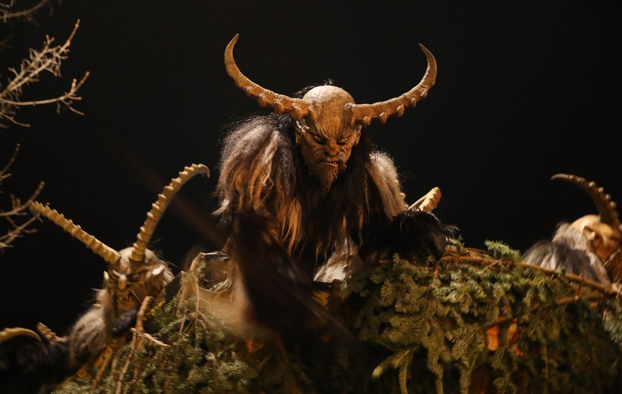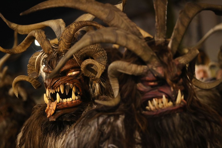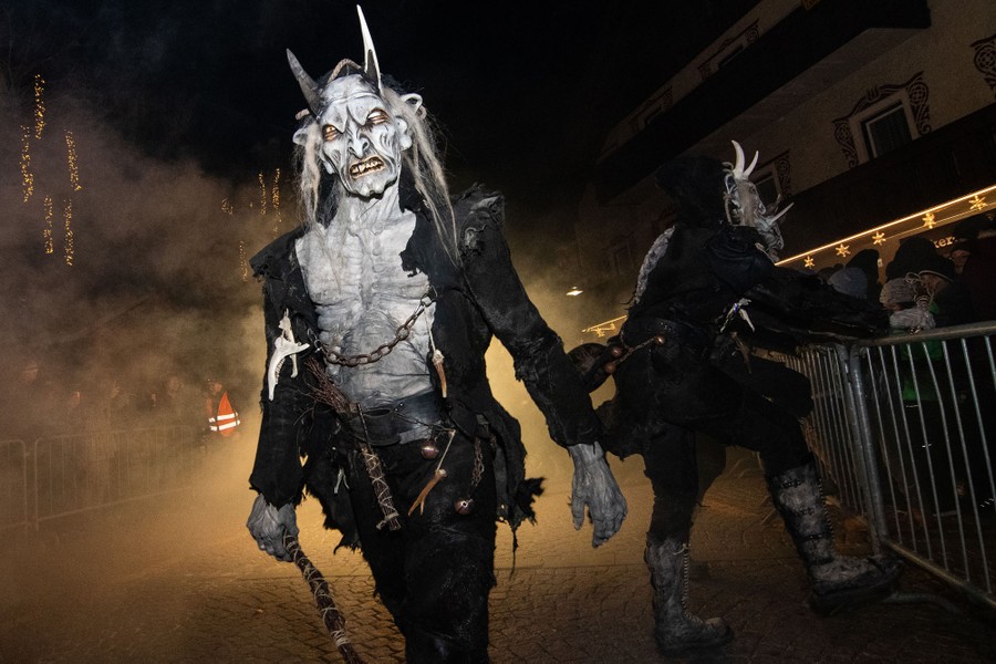 While tales of Saint Nicholas feature him bringing gifts to good boys and girls, ancient folklore in Europe’s Alpine region also speaks of Krampus, a frightening beastlike creature who emerges during the Yule season, looking for naughty children to punish in horrible ways—or possibly to drag back to his lair in a sack. Krampus associations in villages hold parades without Saint Nick, frightening children on Krampusnacht, chasing them and hitting them with sticks, during an (often alcohol-fueled) run through the dark streets.
