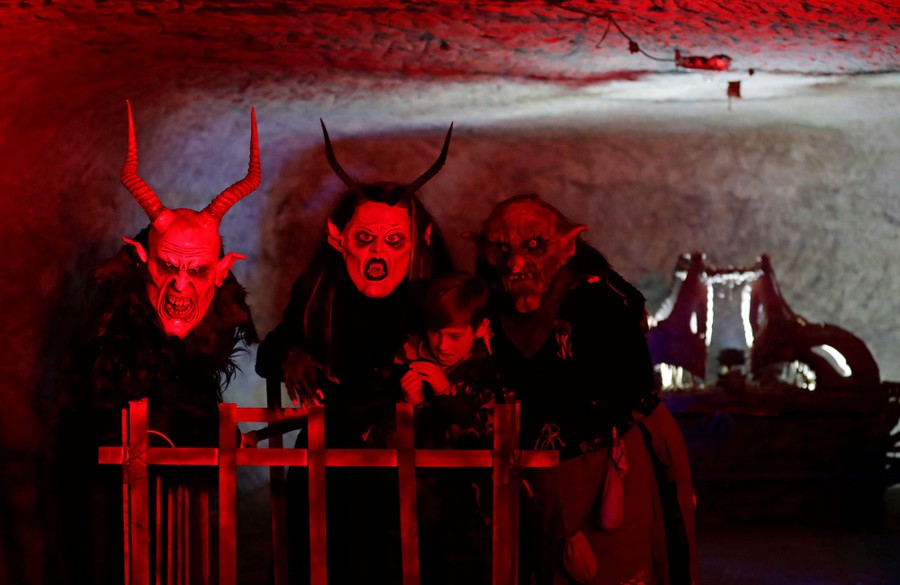 Read morePeople dressed as demons keep a child inside a pen as part of a tradition to determine whether he had behaved well during the past year, inside of a sandstone cave in the village of Svitava, near the town of Cvikov, Czech Republic, on November 24, 2018. #