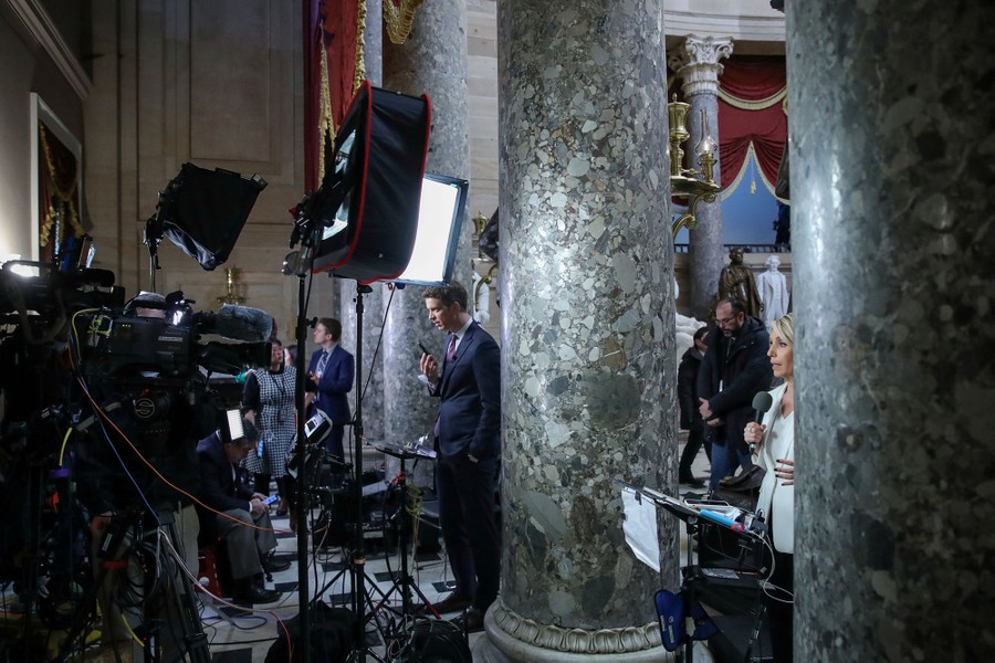 Read moreMembers of the news media work inside National Statuary Hall, on Capitol Hill, on December 18, 2019, prior to votes in the House of Representatives on the impeachment of President Donald Trump on charges of abuse of power and obstruction of Congress. #