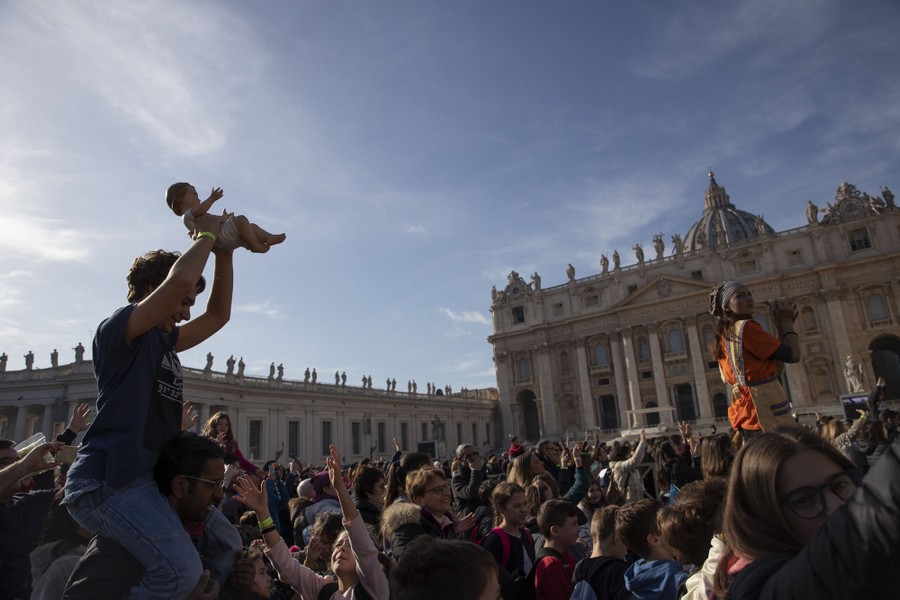 Read moreChildren hold up statues of baby Jesus as Pope Francis blesses them during the Angelus noon prayer, which he celebrated from the window of his studio overlooking Saint Peter's Square, at the Vatican, on December 15, 2019. #