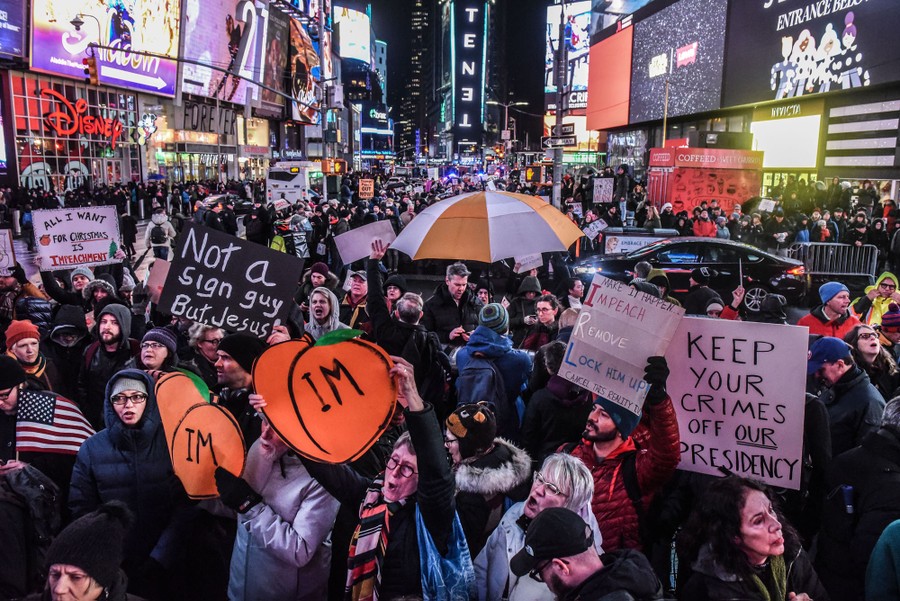 Read morePeople gather in Times Square, in New York City, on December 17, 2019, while participating in a protest in support of President Donald Trump's potential impeachment. #