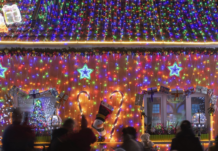 Read morePeople stand in front of Mario Leicht's decorated house, in Walschleben, Germany, on December 17, 2019. Leicht decorates his family home every year. This year, there are probably 145,000 lights and aabout eight kilometers of light strings and tubes. #