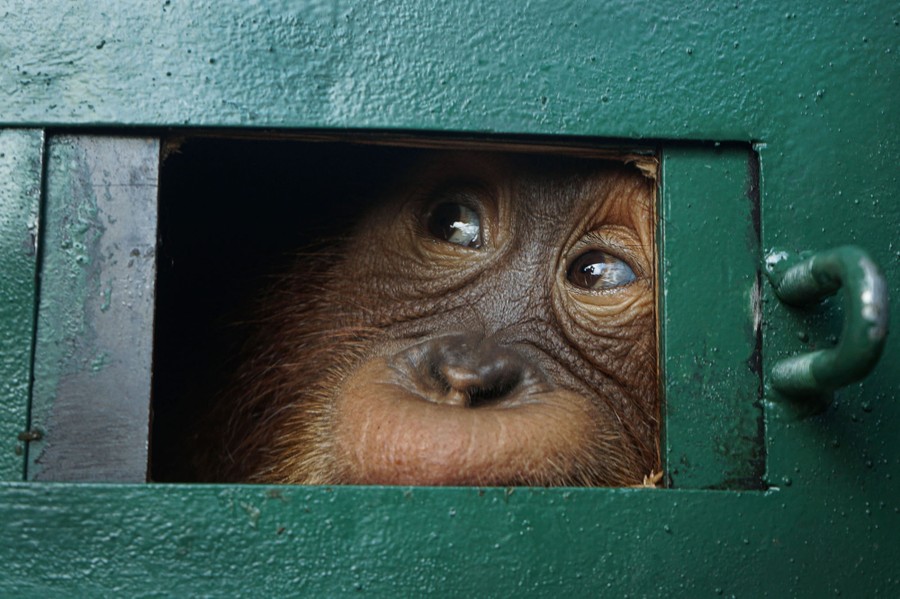 Read moreOrangutan Bon Bon looks out from inside a cage after arriving at the Kualanamu International Airport, in Deli Serdang, North Sumatra, from Bali on December 17, 2019. The baby orangutan was drugged by a Russian trafficker in a failed bid to smuggle it out of Bali, but was rescued and will be released back into the wild. #