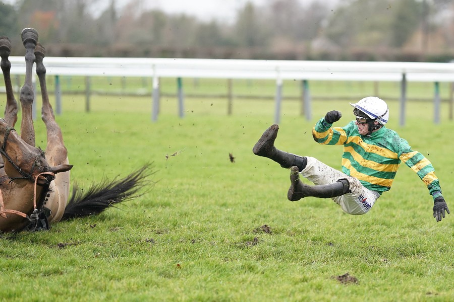 Read moreTom O'Brien, riding Gelboe De Chanay, falls in the "Follow at the Races on Twitter" juvenile hurdle at Fontwell Park Racecourse, in Fontwell, England, on December 10, 2019. #