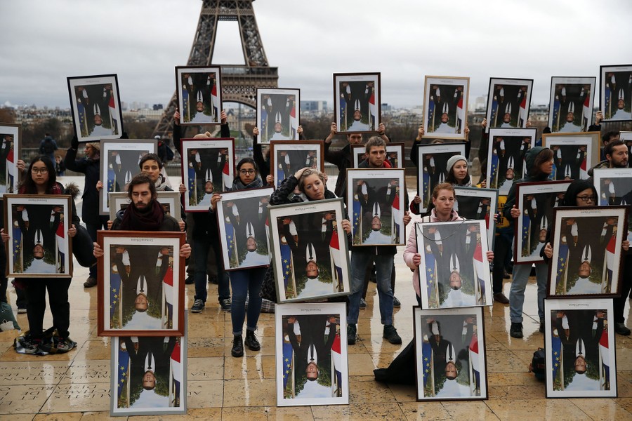 Read moreOne hundred activists hold portraits of French President Emmanuel Macron upside down to urge France to take action during the UN COP25 climate talks in Madrid, during a gathering at the place du Trocadéro, facing the Eiffel Tower, in Paris on December 8, 2019. Environmental activists around France have removed Macron's official portrait from town halls around the country in an unusual protest movement aimed at pushing him to do more to slow climate change. #
