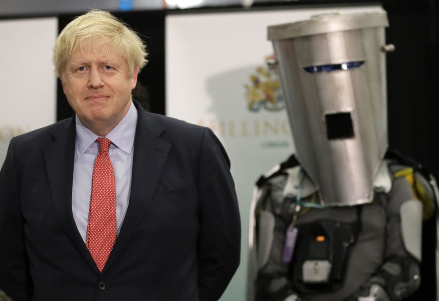 Read moreThe independent candidate Count Binface (right) stands with Britain's prime minister and the Conservative Party leader, Boris Johnson, as they wait for the Uxbridge and South Ruislip constituency-count declaration at Brunel University London, in Uxbridge, London, on December 13, 2019. #