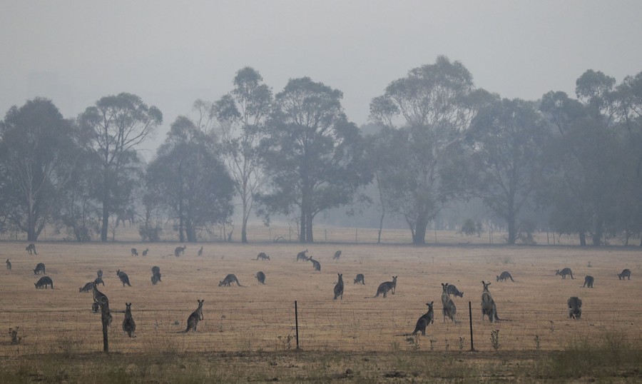 Read moreKangaroos graze in a field as smoke shrouds the Australian capital of Canberra, Australia, on January 1, 2020. Australia deployed military ships and aircraft to help communities ravaged by apocalyptic wildfires that destroyed homes and sent thousands of residents and holidaymakers fleeing to the shoreline. #