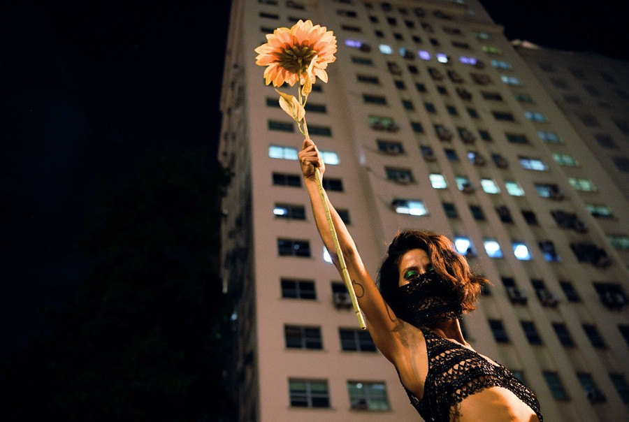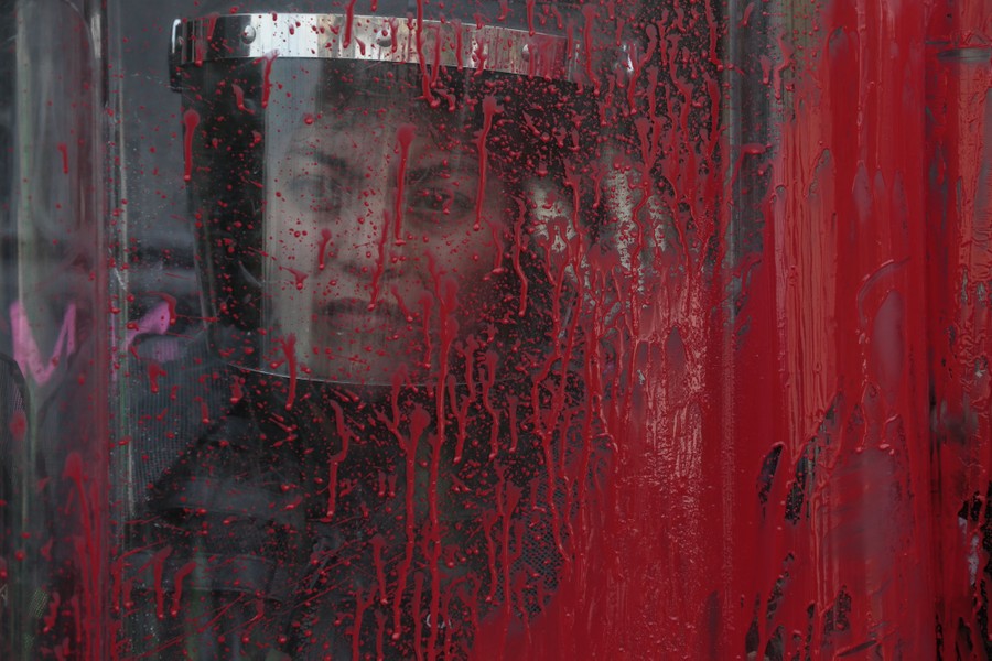 Read moreA police officer stands behind her riot shield covered in red paint during an International Women’s Day march in Mexico City’s main square, the Zócalo, on March 8, 2020. #